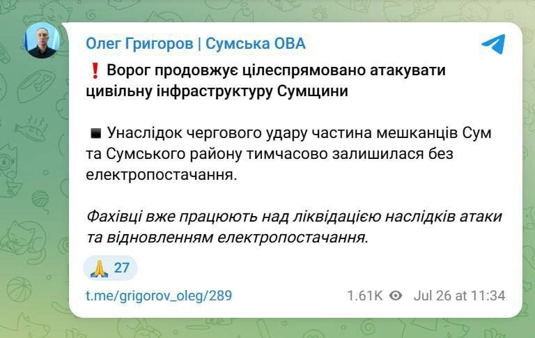 В результате удара без электроснабжения осталась часть Сум и Смуского района. Обесточен один из городских водозаборов — без воды несколько улиц и часть пригорода.