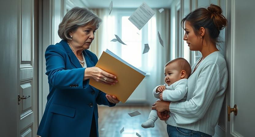 Листы разлетелись по полу прихожей, как осенние листья на ветру. Ксения стояла, прижимая к груди годовалую дочку, и не могла поверить в происходящее. Ещё вчера они жили одной семьёй, а сегодня свекровь выставляла её за дверь вместе с внучкой.