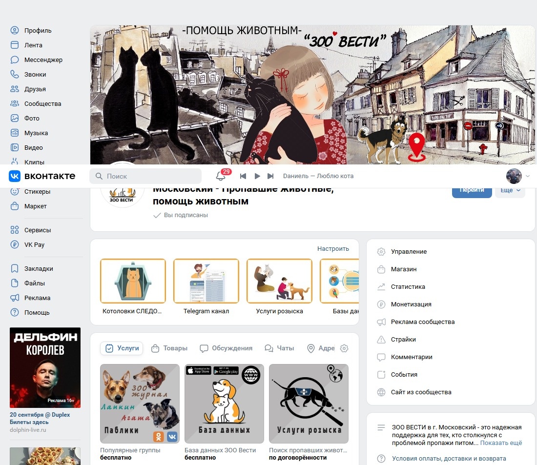 2. Телеграмм канал о пропавших животных: https://t.me/zoovesty