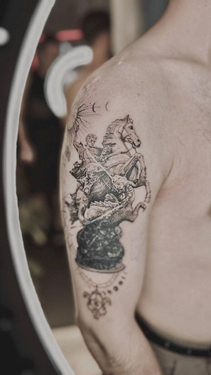 ✨ Отважный Георгий Победоносец в деле! ✨ Посмотрите на это невероятное тату, где легендарный святой изображен верхом на коне, сражающимся с драконом! 💪 Этот символ мужества и победы над злом вдохновляет уже века. Детали захватывают дух: струящиеся линии, тени и небесный серп луны с звездами добавляют магии. А изящная основа с цветами и геометрическими узорами подчеркивает силу и красоту. Докажи свою внутреннюю силу — лайк, если вдохновился, и делись с друзьями! 🌟 #ГеоргийПобедоносец #ТатуИскусство #СилаИМужество #ТатуМагия