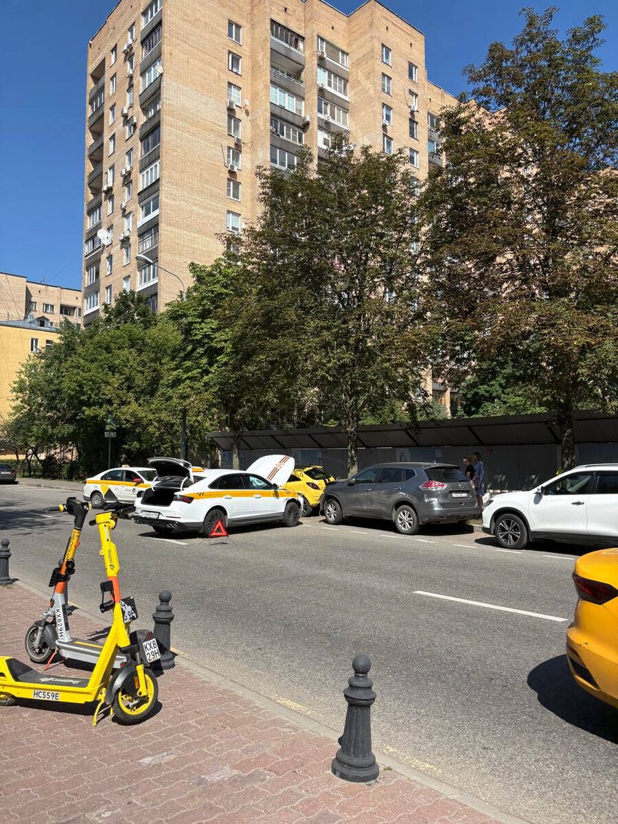 На Малой Грузинской рядом с домом Высоцкого очень странная авария — сразу четыре автомобиля на пустой улице