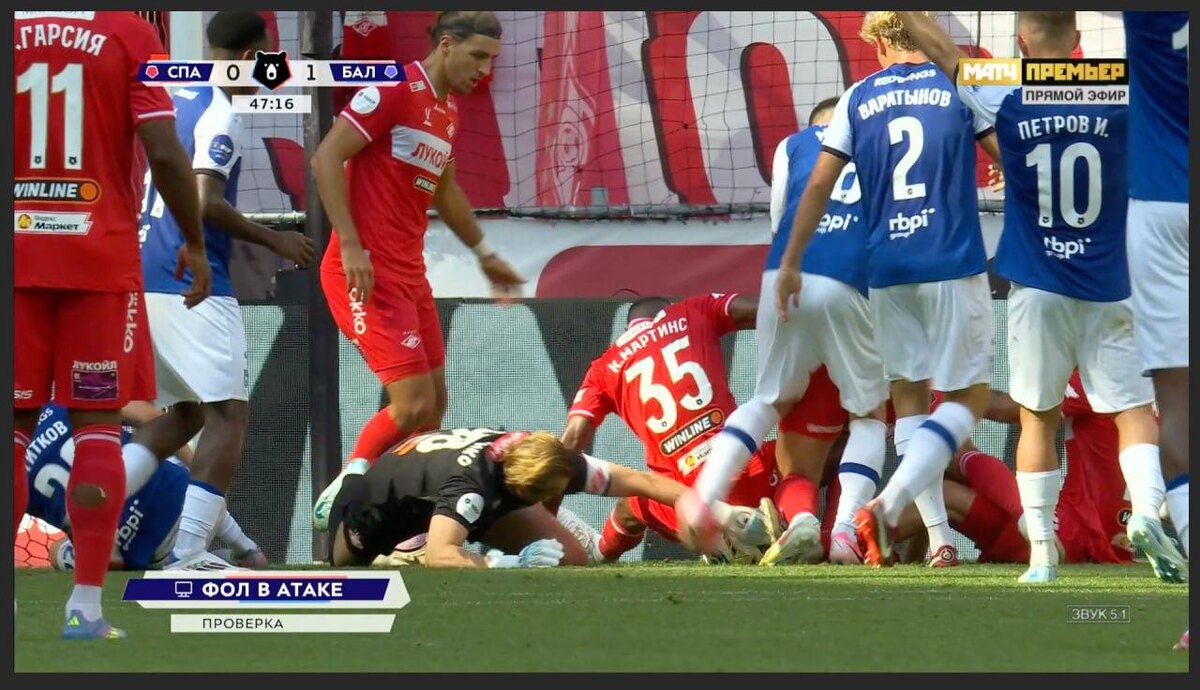 ♦️ 🇷🇺 Веселье в матче «Спартака» продолжается! В концовке первого тайма «Балтика» поразила ворота красно-белых: Брайан Хиль протолкнул мяч в сетку из толчеи в штрафной хозяев. Видеоассистенты долго изучали эпизод, поскольку в толпе игроков не было ясно наверняка, фолил ли кто-то. Арбитр Сергей Карасёв сам пошёл к монитору и вынес вердикт: калининградцы нарушили правила против голкипера Александра Максименко, гол отменён. @russian_rt_sport