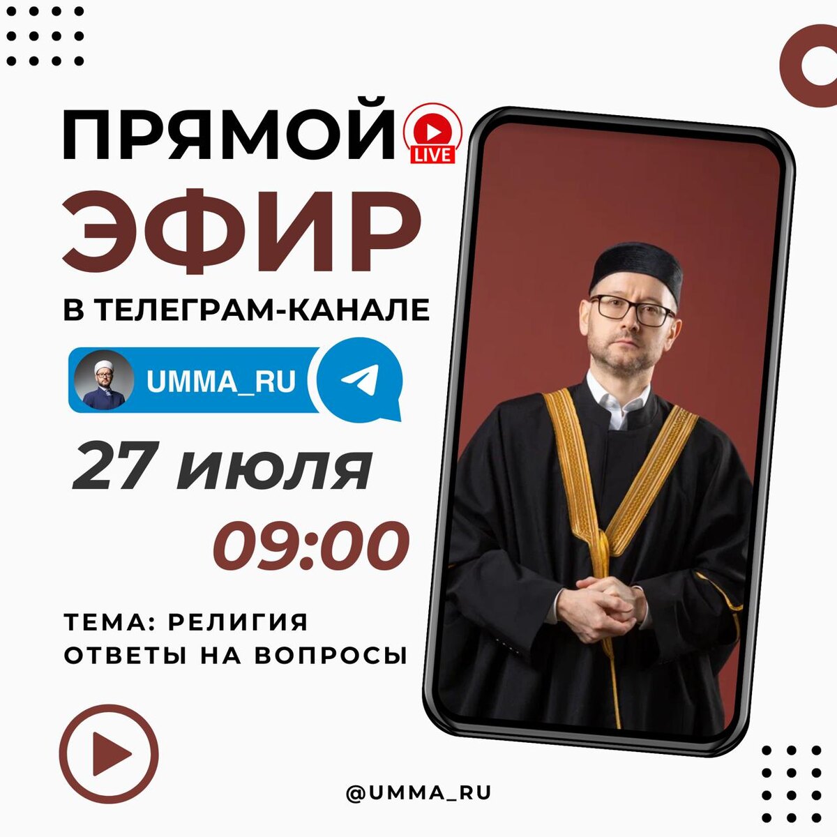 27 июля в 09:00 — прямой эфир с Шамилем Аляутдиновым Только в Telegram на канале @umma_ru 🔹 30 минут — вопросы и ответы по религии. ⏳ Будьте вовремя. Пишите ваши вопросы в комментариях 👇