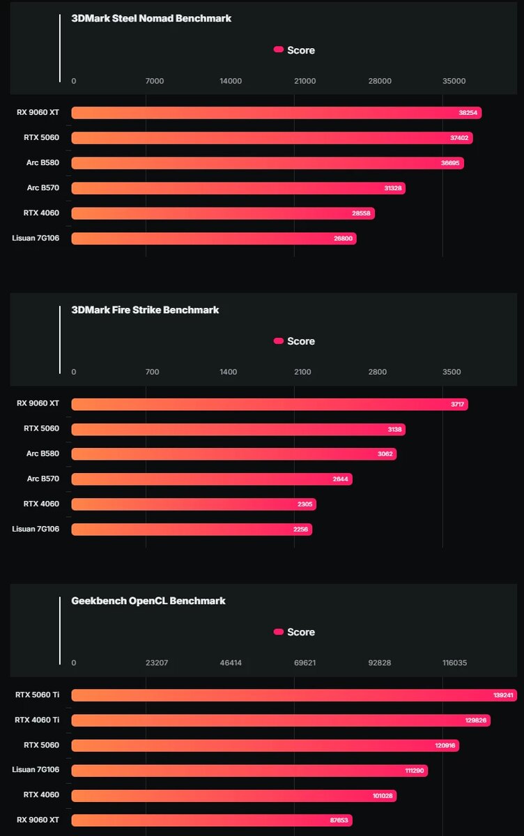 Китайская компания Lisuan Technology представила свою первую высокопроизводительную игровую видеокарту G100, которая, согласно последним тестам, превосходит NVIDIA GeForce RTX 4060 в бенчмарке на основе OpenCL. Это значительный шаг для китайской полупроводниковой индустрии, стремящейся к технологической независимости. В связке с процессором AMD Ryzen 5 7600 видеокарта набрала 111 290 баллов, опередив RTX 4060 (101 028 баллов) и приблизившись к RTX 5060 на архитектуре Blackwell (~120 916 баллов). G100, созданная на 6-нм техпроцессе SMIC, оснащена 12 ГБ видеопамяти (предположительно GDDR6), 48 вычислительными блоками и частотой до 2 ГГц. Поддержка DirectX 12, Vulkan 1.3 и OpenCL 3.0 обеспечивает совместимость с современными играми. К сожалению, одними лишь "железными" возможностями мастадонтов рынка не победить, что мы уже видим на примере графики Intel, а потому Lisuan нужно еще и написать хорошие драйверы. Единственная игра, которую компания показала работающей на этой видеокарте — Bla