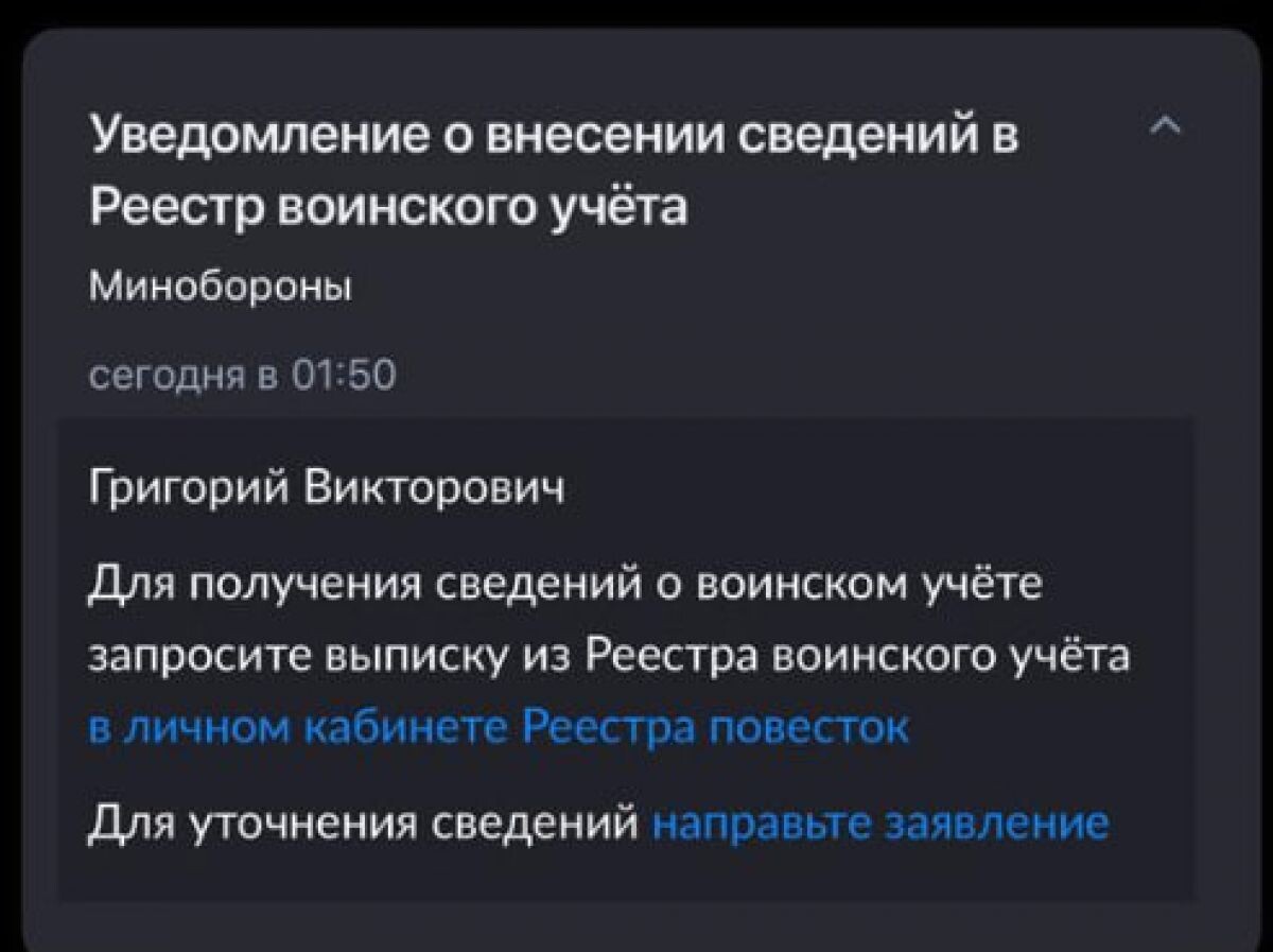 Жителям Брянской области через Госуслуги стали приходить уведомления о внесении сведений в реестр воинского учёта. С чем это связано, что делать брянцам в этой ситуации и стоит ли что-то делать вообще? Как сообщают «Тульские новости», данное сообщение носит ознакомительный характер. Оно несёт информацию, что данные граждан вносятся в электронный реестр военнообязанных. Явиться в военкомат необходимо только по официальной повестке, в которой чётко указаны дата, время, адрес и цель вызова, данное уведомление не является такой повесткой. Данное уведомление не возлагает на граждан какие-либо обязанности. Но следует учитывать, что именно так в перспективе будут приходить повестки, необходимо следить за оповещениями от органов государственной власти.