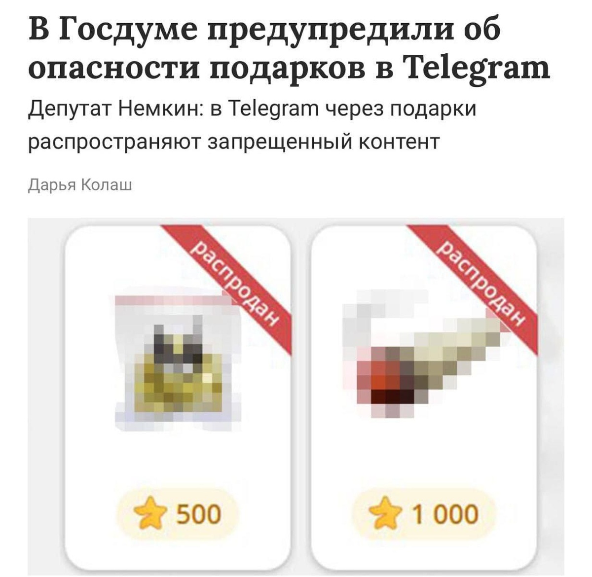 Госдума: россияне рискуют тюремным сроком за подарки в Telegram с запрещёнными ссылками. В Госдуме предупредили, что мошенники отправляют пользователям в Telegram подарки с ссылками на запрещенные материалы. Если пользователи не удаляют эти ссылки, злоумышленники подают жалобы в Роскомнадзор, что может привести к блокировке аккаунтов и привлечению силовиков. Это создает риск уголовной ответственности для администраторов и пользователей за распространение запрещенного контента, сообщил член комитета по инфополитике Немкин. ────────── ⚡️Важные новости – без лишнего шума!⚡️ Подпишись на канал и получай только суть: оперативно, чётко, по делу! 👉 ИнфоСплетник | @infospletnik