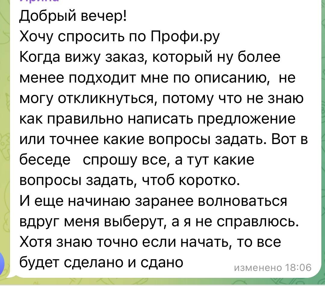 Спасибо, что поделились, это очень узнаваемая ситуация, когда вроде бы и хочется откликнуться, но непонятно, с чего начать и как не упустить важное. Можем порекомендовать вам курс «Диагностическая консультация». Он как раз для тех, кто: – теряется, какие нужно задать вопросы клиенту, – не знает, как продолжить дмалог после консультации, – боится «переборщить» или, наоборот, упустить важное. Внутри курса — чёткий перечень вопросов, с пояснениями, зачем они нужны и что помогут выяснить. Эти вопросы не только проясняют объём работ, но и дают клиенту понять, что вы разбираетесь в его бизнесе, а это сильно повышает доверие. Если пока не готовы к курсу — приходите для начала на повтор мастер-класса. Мы там как раз дарим файл с 12 вопросами, которые стоит задать на первой встрече. Это хорошее начало, чтобы на «Профи.ру» чувствовать себя увереннее и не бояться откликнуться. Вы справитесь, просто возьмите себе рабочие инструменты, и всё получится