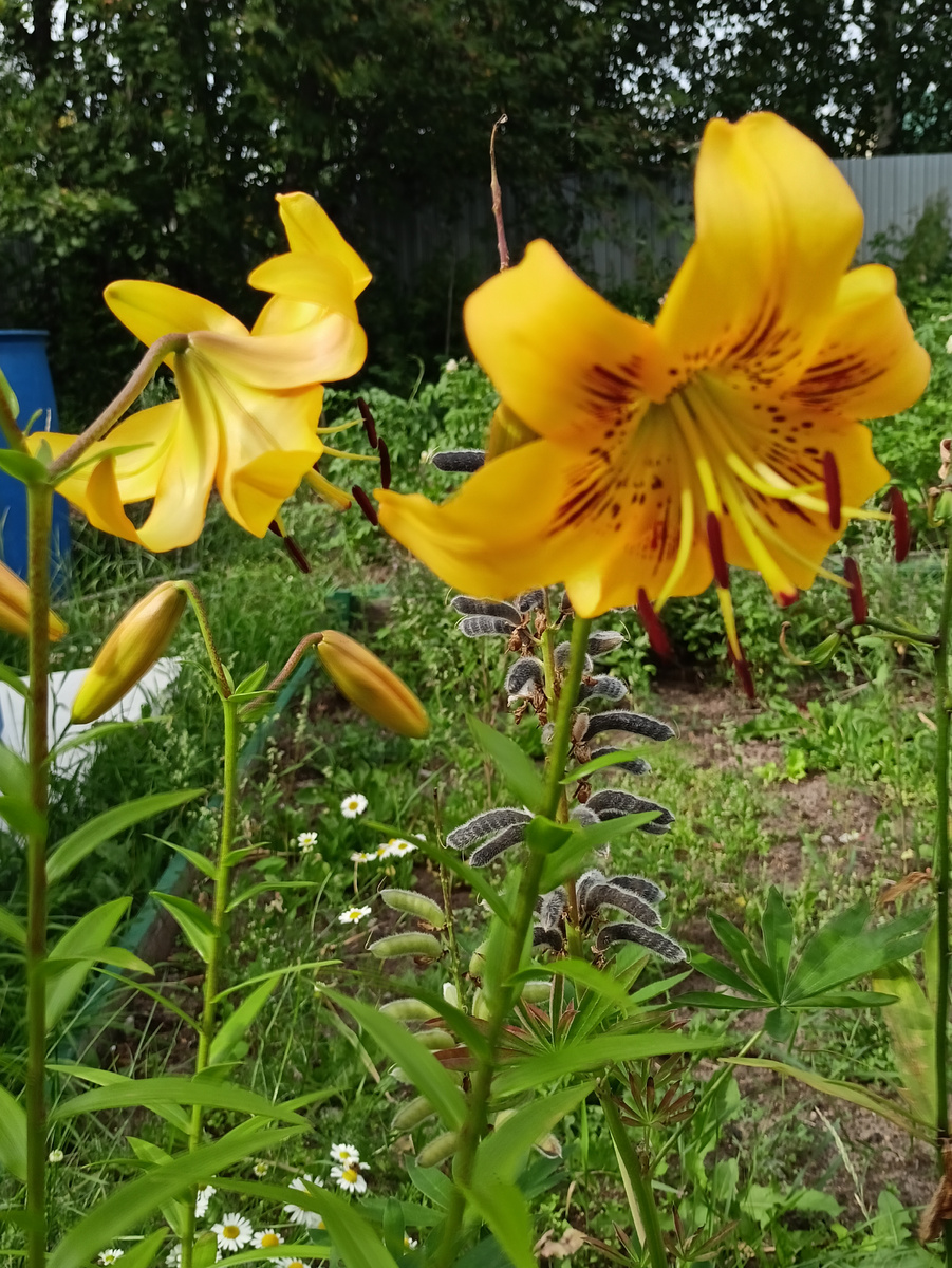 Сегодня вот такие жёлтые лилии у меня расцвели. Приветствую всех кто заглянул !!! Погода радует, +21. Но солнышка нет. Обещан был ливень, но пока нетути. Планы на сегодня у меня , сесть на шпагат , на грядки. Травищи туча, страшно дело. 🥴 То холод, дождь, то праздники у нас, не до суг было, хотя на этих грядках толком ничего и не выросло, безобразие . Это показываю лилии средь ромашек. ПроснуМшись, собралась в магазин сначала. Поехала, захватила с собой свой мусор по пути выкинуть. Остановилась у мусорки, выкинула. Только села в машину, мама звонит, ну и стою значится у мусорки, разговариваю в машине. В зеркало вижу две женщины подошли, одна с мусорным пакетом, вторая стул несёт, и смотрю так она его хорошо забросила, да вглубь контейнера, надо же посмотреть 🧐, что за стул. Они ушли я с телефоном , с мамой же разговариваю, подошла, вроде норм, попыталась достать, одной рукой никак, зацепился за большой мешок с мусором и люди идут откуда не возьмись , фоткаются на дороге, весёлые