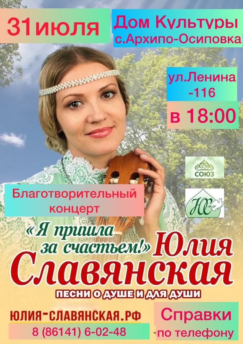 Ближайшие мои концерты, друзья! - ГЕЛЕНДЖИК - 27 ИЮЛЯ в 18.00 , День ВМФ на Лермонтовской набережной. - с. АРХИПО - ОСИПОВКА - 31 ИЮЛЯ в 18.00 , Дом Культуры, ул.Ленина -116. (перенос с 29 июля)!!! - НИЖНЕКАМСК - 17 АВГУСТА в 12.00, Стахеевский фестиваль «ВЕРУЮ» на Набережной города. - КУЛЕБАКИ - 24 АВГУСТА в 18.00 ДК им. Дубровских, ул. Ленина, д.2 БИЛЕТЫ ОН-ЛАЙН: юлия-славянская.рф/afisha/kon... - МОСКВА - 19 НОЯБРЯ в 19.00, Храм Христа Спасителя (Соборный Зал). БИЛЕТЫ ОН-ЛАЙН: на сайте юлия-славянская.рф #ЮлияСлавянская #Православие #добрыепесни #Праздник #концерты #афиша #Россия #Кулебаки #АрхиповоОсиповка #Москва #Нижнекамск #Геленджик #ВМФ