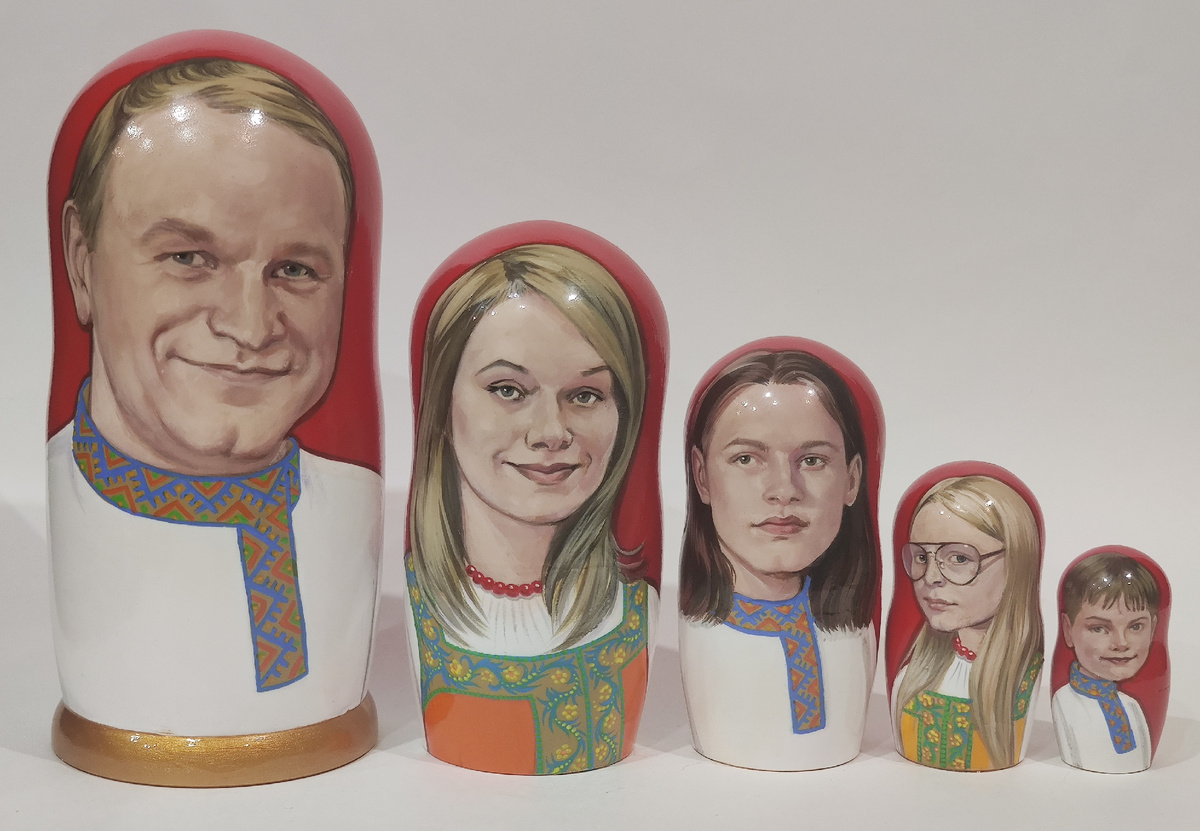 Для справки: Матрёшка- это произведение, состоящее из нескольких разъёмных кукол, складывающихся в одну самую большую. По времени: Заказ художественной росписи матрешек по фотографиям - за 9- 90 дней до знаменательной даты. Возможны срочные варианты - 1-8 дней. При количестве от 10 кукол в матрёшке - 9-14 дней. Стоимость складывается из нескольких параметров - высота главной куклы в матрешке, количество кукол в матрешке и лиц на каждой кукле, композиция (поясная, фигура, сюжет, с узорами на фоне), дополнения - логотипы, подписи, другие детали - предметы, животные и пр. Стоимость зависит от высоты главной -15,18,21,25. 30, 35, 40 см самой большой куклы в матрёшке, от композиции и дополнений. Подробнее можно посмотреть на моём сайте. Каждый заказ индивидуален. Для заказа звоните +79161388382