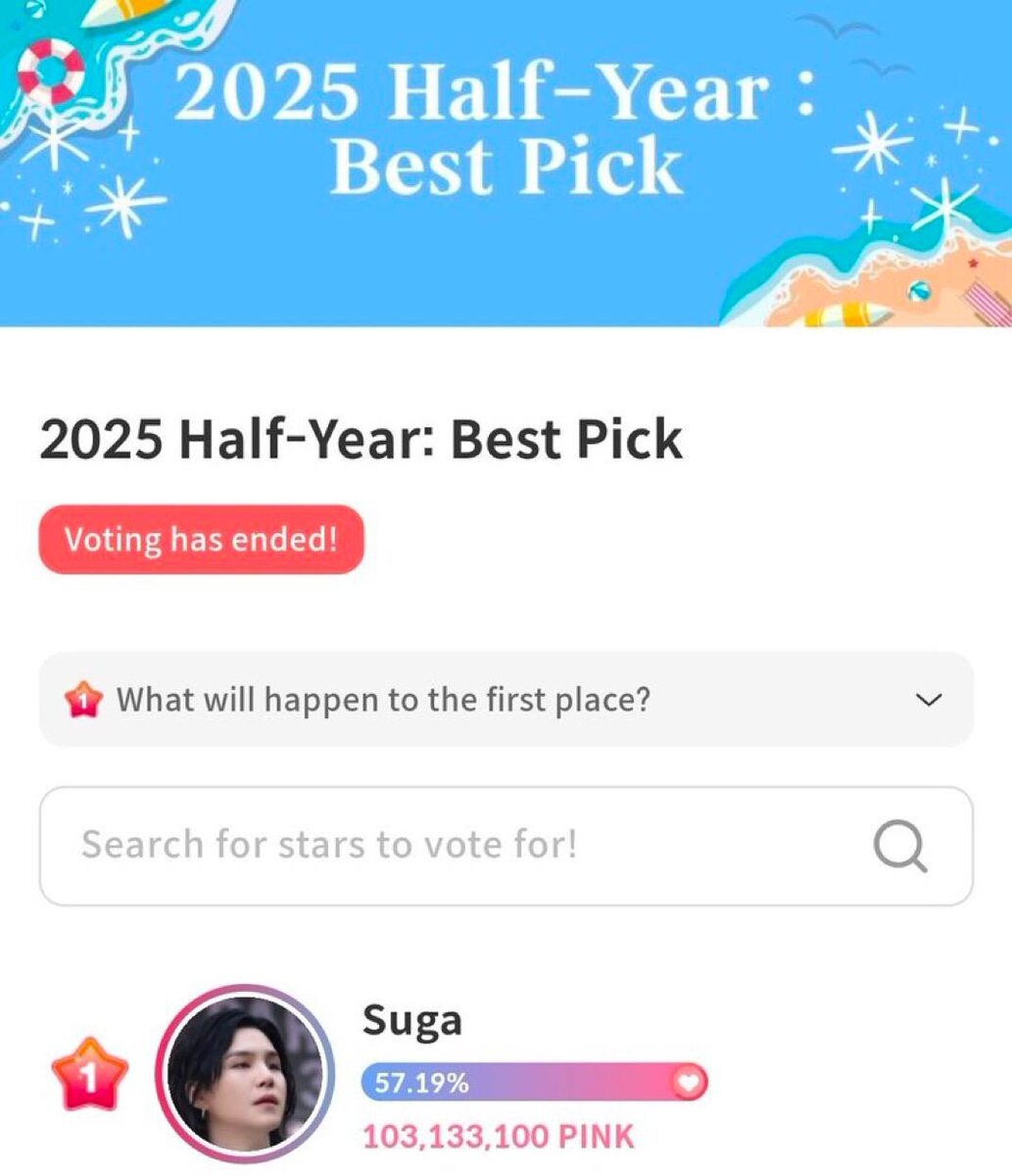 SUGA победил в голосовании “2025 Half-Year Best Pick” (Лучший выбор за первое полугодие 2025 года) на Giftifan