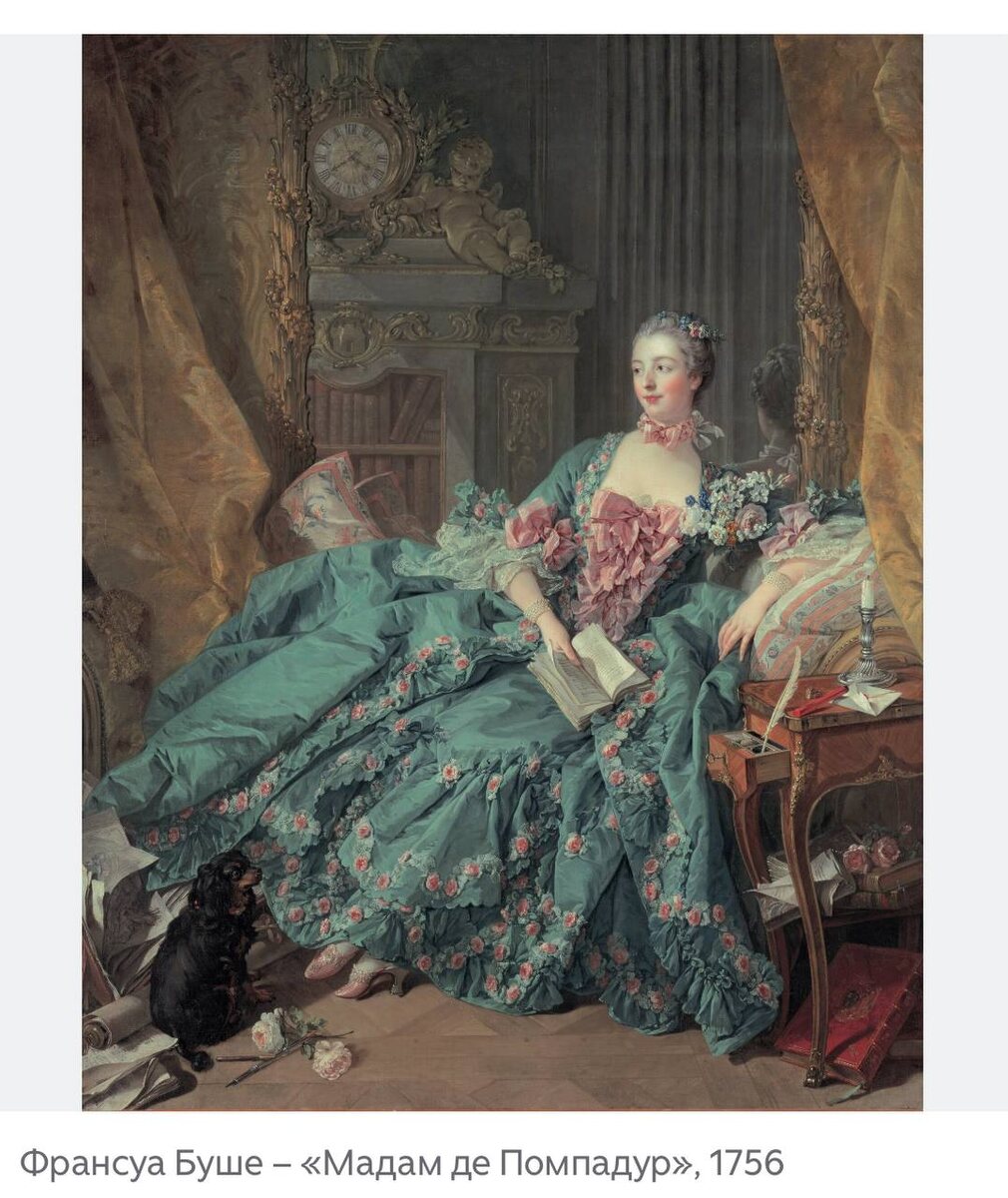 Буше, мадам Помпадур и сердце короля В центре этого огромного (более 2 метров в высоту!) полотна мы видим молодую женщину в бирюзовом вечернем платье, украшенном розами, с пышным кружевом на рукавах. На ногах — коралловые туфли с высоким каблуком, а рядом сидит её домашний спаниель. Белые руки, придерживающие раскрытую книгу, обвивают нити жемчуга. Перед нами будуар светской дамы и её хозяйка — маркиза де Помпадур. Женщина, вошедшая в историю под этим именем, родилась 29 декабря 1721 года. При рождении её назвали Жанной-Антуанеттой Пуассон. Её отец — неудачливый спекулянт Франсуа Пуассон, разорившийся и бежавший из Франции. Опекуном девочки стал финансист де Турнем, который дал ей образование достойное благородной дамы — она обучалась музыке, рисованию, пению и танцам. Однажды в Версале был устроен бал по случаю бракосочетания старшего сына короля Людовика XV. Бал проходил в одном из самых роскошных помещений дворца — Зеркальной галерее. Придворные в костюмах, король в маске, а Жанн