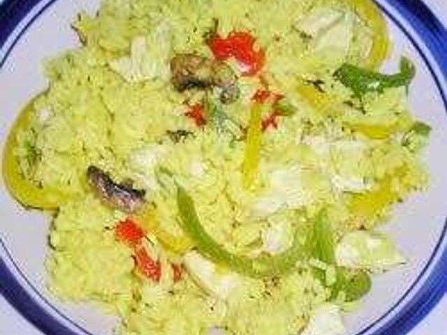 Плов с тремя перцами Блюдо на основе риса с добавлением радужного болгарского перца. 🍴 Количество: 4 порции Ингредиенты ✅ 4 куриных окорочка без кожи ✅ 3 чашки куриного бульона ✅ 1 луковица, нарезанная ✅ 3 зубчика чеснока, нарезанные ✅ 1 чайная ложка молотой куркумы ✅ 100 гр свежих грибов, нарезанных ✅ 350 гр белого риса без варки ✅ 3 помидора, нарезанных ✅ 1 красный болгарский перец, нарезанный ✅ 1 зеленый болгарский перец, нарезанный ✅ 1 желтый болгарский перец, тонко нарезанный. Инструкция приготовления 1. В большой кастрюле отварите куски курицы в курином бульоне, добавив лук и чеснок перед закипанием. Когда курица сварится, выньте ее из бульона и отложите в сторону. Добавьте куркуму и перемешайте, затем отставьте бульон в сторону. 2. В большой сковороде разогрейте масло. Добавьте грибы и обжаривайте их в течение 1 минуты. Добавьте рис, перемешивайте в течение 2 минут, затем добавьте бульон. Тушите все на медленном огне 20 минут. Тем временем очистите помидоры от кожицы и на