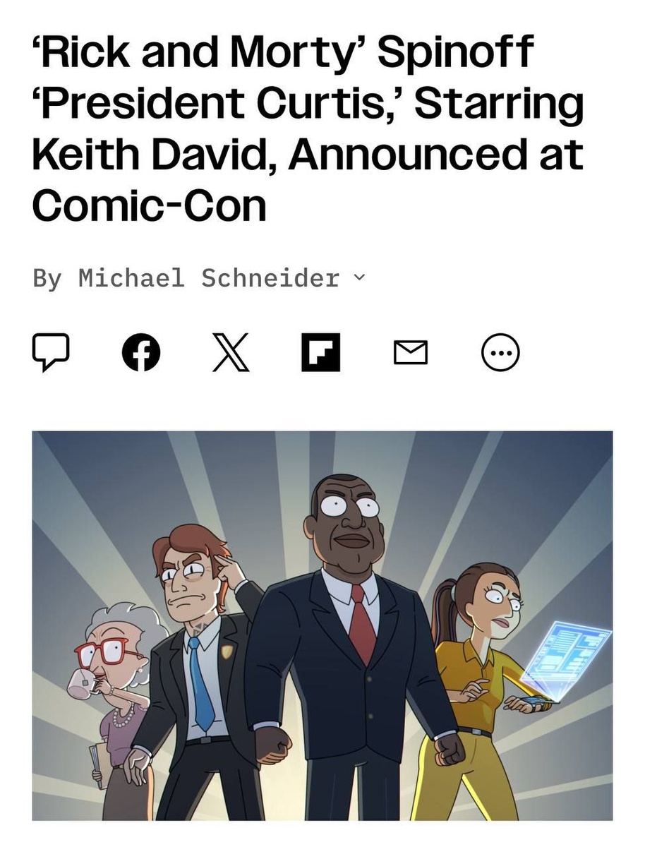 На Comic-Con официально анонсировали спин-офф сериала «Рик и Морти» под названием «Президент Кёртис». Новая история сфокусируется на главнокомандующем Кёртисе и его необычном штабе, который занимается решением межпространственных кризисов и расследуют странные необъяснимые явления. Создатели обещает сохранить фирменный юмор и безумие оригинала, расширяя вселенную «Рики и Морти» новыми приключениями и персонажами.