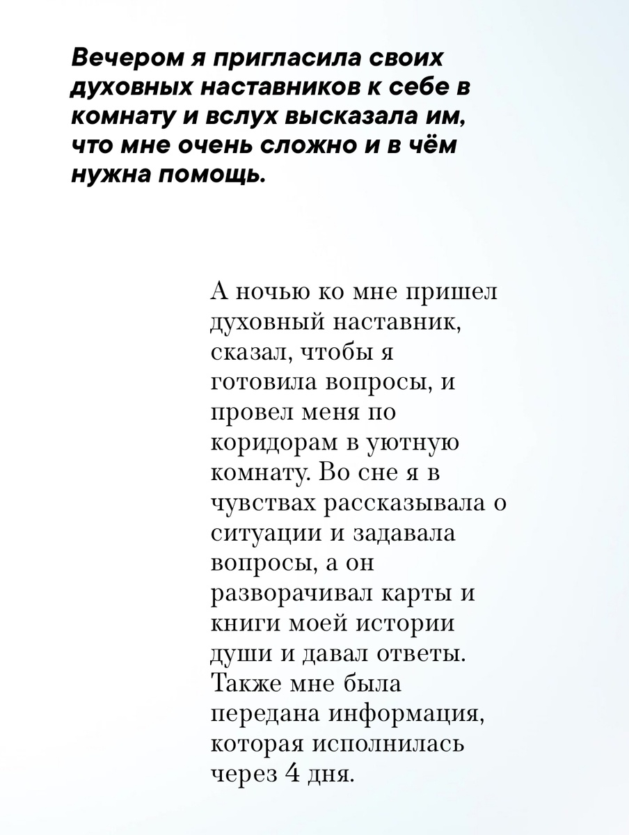 Ну что давно я не рассказывала личные истории связи с тонким, а они уже снова накопились 🌝🤲 Здесь записала предисловие голосовым Это был тот случай, когда из глубины души обращаешься к Высшим силам, а не просто в уме зацикливаешься на проблемах. Именно это я и называю обращением к Высшим силам: когда моё внимание направлено на них, когда я чётко выразила, в чём мне сложно и в чём нужна помощь. Также я осознанно попросила облегчить данный период жизни. ... Той ночью я плохо спала. Где-то в четыре утра я встала попить воды, походила по предрассветной комнате и вернулась в постель. Я включила медитацию и очень быстро оказалась в осознанном сновидении, где услышала голос моей покойной бабушки, которая обращалась ко мне. Очень быстро я поняла, что это лишь образ мне показывают бабушки, чтобы я почувствовала безопасность и могла довериться. Я спросила: — Кто ты на самом деле для меня? — Можешь считать меня наставником. Прозвучал ответ. Образ сразу трансформировался в приятного на