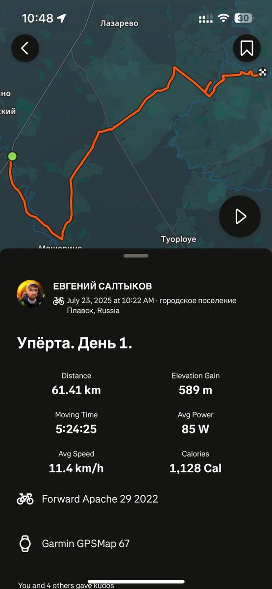 Примерно за 4 км до места стоянки попали под 🌧️ дождь и здесь я обнаружил повреждение покрышки, которая проколола т на усадьбе. Пришлось менять под дождем. Также, теперь я понимаю, что крылья это зло. Невозможно с крылом велосипед протащить по грязи, даже руками. Колесо просто не крутится.