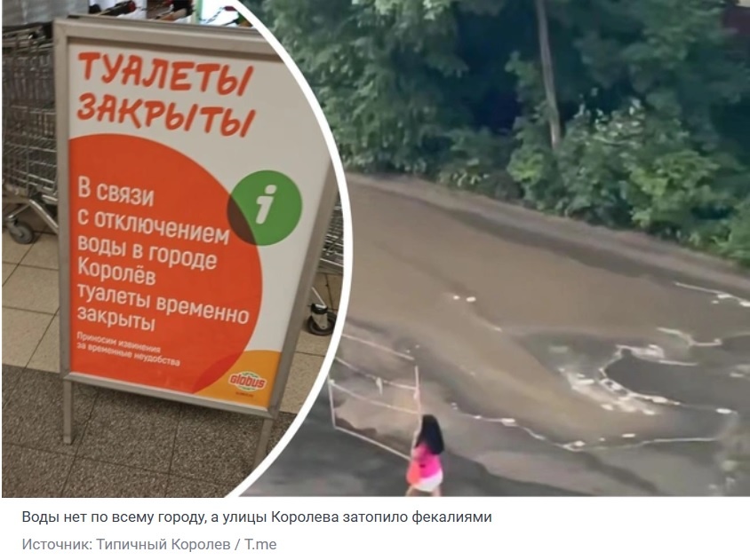 С нашей редакцией связались жители Королева (Московская обл). Они возмущены целой серией произошедших в городе коммунальных аварий. Сначала, 24 июля 2025 г. в результате аварии на канализационно- насосной станции в микрорайоне Юбилейный, в 43 квартале, Подлипках-Дачных, Залинейном районе, Завокзальном районе, Новых Подлипках, микрорайоне Юбилейный, микрорайоне Текстильщик не стало воды. А по улице Нестеренко потекла река нечистот. 25 июля в городе не стало горячей воды. Точнее вода была, но была по температуре мало отличима от холодной. 26 июля - коллапс, то вообще не было никакой воды; то из крана текла струйка воды, слишком, грязная, для того чтобы быть питьевой, слишком холодная, для того чтобы быть горячей, и слишком тонкая, для того чтобы ее можно было использовать хотя бы для слива. Мэр королева и губернатор области объявили, что вот-вот починят, уже чинят, уже очень-очень, быстро-быстро чинят и исчезли со связи, после чего отключили комментарии на своих телеграмм каналах. В связ