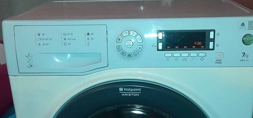 Приезжаю к клиенту, захожу и как водится уточнив "заявленный" дефект, включаю стиралку для его подтверждения, и действительно стиралочка заблокировав дверь, через пару секунд замигала индикаторами и выдала ошибку F08 :) И сразу так полегчало, потеплело и настроение подскочило :) Ибо люди кто в теме уже поняли, что для EVO2 F08 хоть и означает "датчик уровня формирует одновременно сигналы ПУСТОЙ БАК и ПОЛНЫЙ БАК", но по факту это всегда дефект нагревателя, причем спираль может быть целой, и стиралка иногда даже может греть. А вот сопротивление изоляции этого ТЭНа зачастую "гуляет", что и приводит к появлению ошибки. Правда инженерам она не задумывалась как реакция на пробой изоляции ТЭНа, просто при пробое изоляции, ток утечки просаживал тестовое напряжение с датчика уровня и процессор видел одновременно си