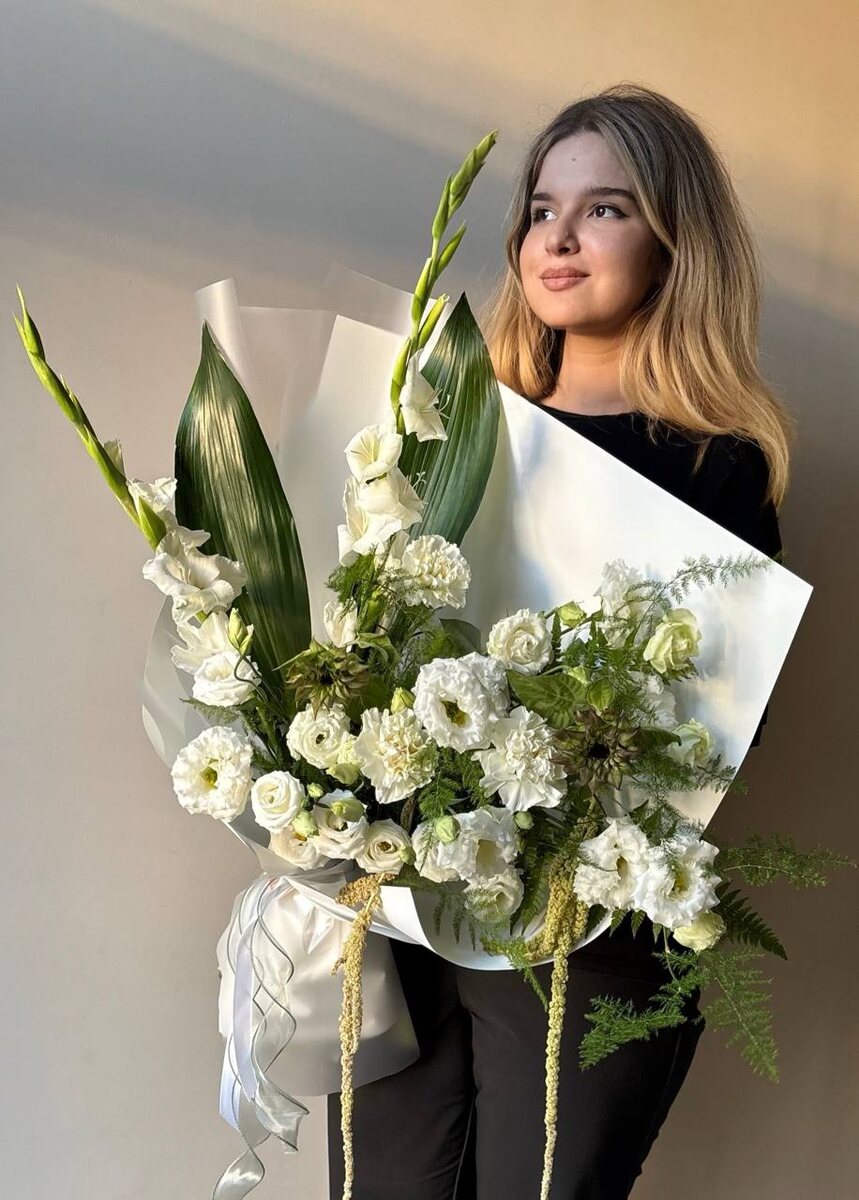 Благородная аспидистра, нежные гладиолусы и диантус в обрамлении сочной зелени. А еще — зеленый подсолнух, лизиантус и роскошный амарант для завершающего акцента.