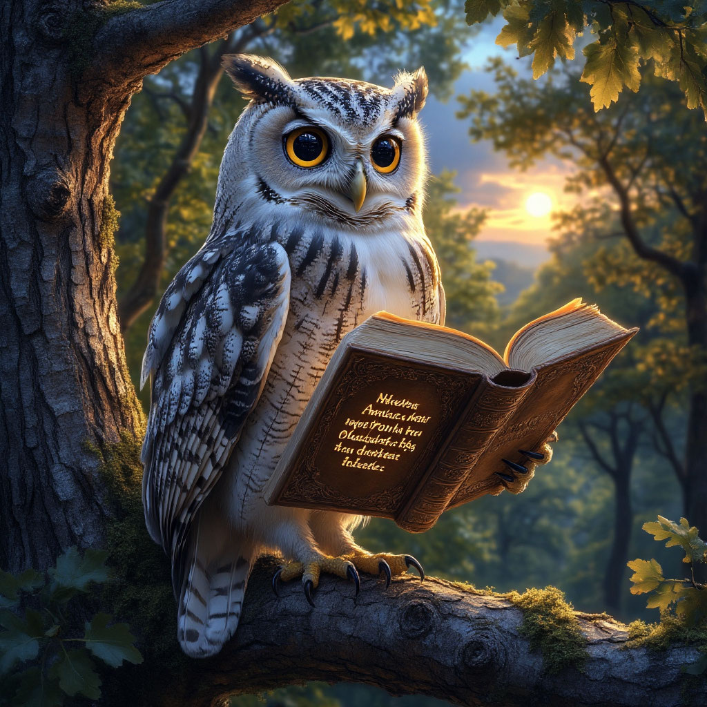 В дремучем лесу, где вековые деревья тянулись к небу, а их кроны создавали плотный шатёр, жила старая сова. Её перья отливали серебром, а глаза светились мудростью тысячелетий. Местные жители говорили, что она знает все тайны леса и может научить человека истинному знанию. Однажды в лес забрёл молодой путник. Он искал ответы на вопросы, которые мучили его душу. Услышав о мудрой сове, он решил найти её. Долго бродил он среди деревьев, пока не увидел величественную птицу, сидящую на самой высокой ветке древнего дуба. — Кто ты и что тебе нужно? — раздался глубокий голос совы. Путник рассказал о своих поисках. Сова улыбнулась (если сова может улыбаться) и согласилась научить его мудрости. Первый урок был о внимательности. Сова показала, как важно замечать мелочи: шелест листьев, пение птиц, движение тени. «Всё в природе имеет смысл», — говорила она. Второй урок касался терпения. Сова научила путника ждать, не торопиться, находить гармонию в спокойствии. Она рассказала, что даже самая