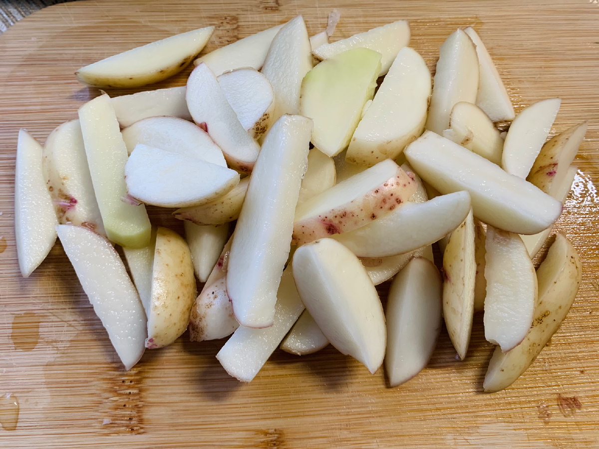 Когда очень захотелось картошки и хочется приготовить ее как-то необычно, то можно приготовить картошку фри. Готовится просто, получается лучше чем в заведениях быстрого питания. Ингредиенты: 1) Картофель - 10 средних клубней. 2) Растительное масло - 300 мл. 3) Соль - 0,5 чайной ложки. Для соуса: 1) Сметана - 4 ст.л. 2) Чеснок - 1 шт. 3) Укроп - пучок. Процесс приготовления: 1) Я брала молодой картофель, поэтому не чистила его. Моем картофель и нарезаем продольными кусочками. 2) Кладем в миску и заливаем холодной водой. Даем постоять 5 минут, сливаем воду и повторяем процедуру. Это нужно чтобы вымылся крахмал. 3) Выкладываем картофель на салфетки, чтобы ушла лишняя влага. Сверху также накрываем салфетками. 4) Наливаем в сковородку растительное масло, чтобы получилось 2-2,5 см. Сразу добавляем соль и размешиваем. Ждем пока масло нагреется и выкладываем картофель на сковороду по одной штуке, не наслаивая друг на друга, чтобы картошка равномерно обжаривалась. 5) Периодически помешива