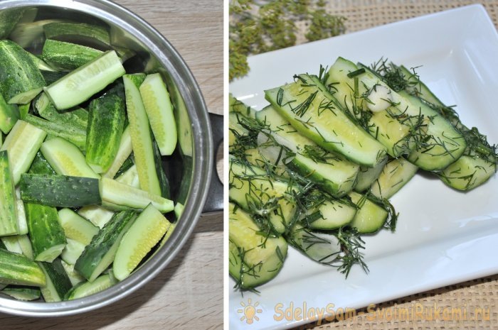 Рецептов засаливания малосольных огурчиков довольно много, и порой выбрать идеальный невероятно сложно. Если вы хотите, чтобы огурцы быстро (буквально за пару часов) стали малосольными, при этом получились ароматными и хрустящими, тогда смело можете приготовить их по этому простому рецепту. Благодаря тому, что огурцы разрезают на несколько частей они очень хорошо и быстро просаливаются, при этом довольно долго (около недели) сохраняют свою малосольность. 1. Огурцы для засаливания замочите на полчаса в холодной воде (для того, чтобы они остались хрустящими), затем хорошенько их помойте и нарежьте небольшими брусочками (четвертинками). Нарезанные огурцы сложите в кастрюлю. 2. Зубчики чеснока очистите и нарежьте тонкими пластинками, а свежий укроп (без зонтиков) – помойте, несколько раз встряхните, чтобы убрать лишнюю влагу, и измельчите. Нарезанный укроп с чесноком добавьте в кастрюлю к будущим малосольным огурцам. 3. Туда же высыпьте 1,5 столовых ложки крупной поваренной соли. 4. Нареза