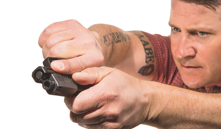 - "Ближний Бой": В драке на дистанции "вытянутого ножа" (3-5 метров) этот метод позволяет сохранять периферийный контроль над противником. Ствол хоть и под углом, но в его направлении.