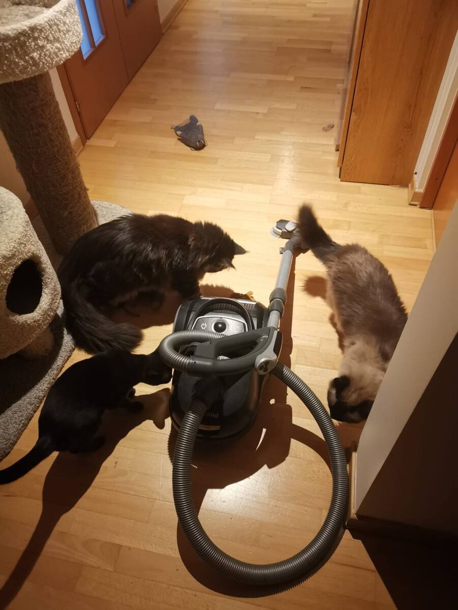 Это заседание кошачьего Совета по отмене пылесоса. В двух частях. Первая - практическая, знакомство с противником. Вторая, - теоретическая, дискуссионная. Как отменить пылесос в данном помещении.