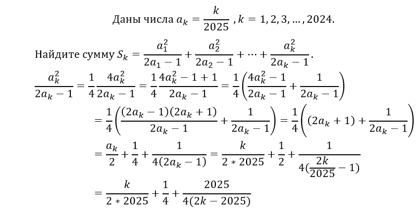 В этом году было много волн ДВИ по математике МГУ. В нём, традиционно, есть несколько базовых заданий, а могут попасться просто очень неудобные задачи. На которые и не натренируешься, и не «постелешь соломку». Рассмотрим шестую задачу на сумму последовательность (раньше она была второй, а шестая была параметром). «Даны числа ak=k/2025, k=1, 2, 3, …, 2024. Найдите сумму a1^2/(2a1-1)+ a2^2/(2a2-1)+…+ ak^2/(2ak-1)». Одна из хороших стратегий: сложное упростить, сложное разбить на несколько более простых. Итак, переходим к решению. То есть сначала мы каждый член суммы разложили на три слагаемых, а потом их просуммировали. Первая сумма – это простая арифметическая прогрессия, для которой мы применили формулу суммы арифметической прогрессии. Вторая сумма – это просто сложение константы. Третья сумма оказалось симметричной относительно нуля: положительные и отрицательные слагаемые в ней взаимно уничтожились. Эту задачу легко берёт Эксель, что бывает не всегда на ДВИ. Тут совсем простой алгори