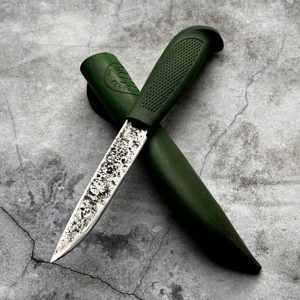 🔪 Нож Финка-108, ✅Сталь Ручная ковка 9ХС Уникальная твёрдость Сталь 9ХС после правильной термообработки достигает твёрдости 61–64 HRC. Это делает её идеальной для реза, даже по твёрдым материалам. Нож дольше держит остроту — меньше заточек, больше надёжности в походе, охоте или работе. резинопластик