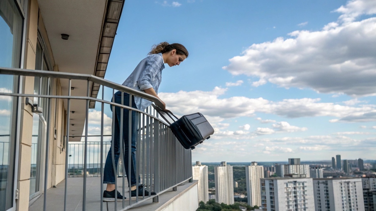 Лера стояла на балконе и смотрела вниз. Седьмой этаж. Высоко. Чемодан летел вниз медленно. Как во сне.