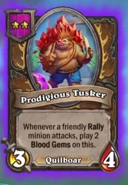 Новые свинобразы в 11 сезоне Полей сражений: 1) Когда ваше существо с Rally атакует, применяет к себе 2 кровавых самоцвета 2) Rally: Применяет к себе 3 постоянных кровавых самоцвета 3) Боевой клич: Свинобраз полуучает Божественный щит 4) Когда ваше существо с Rally атакует, применяет 2 кровавых самоцвета ко всем вашим существам 5) Rally: Ваши кровавые самоцветы дают дополнительные +1/+2 до конца матча