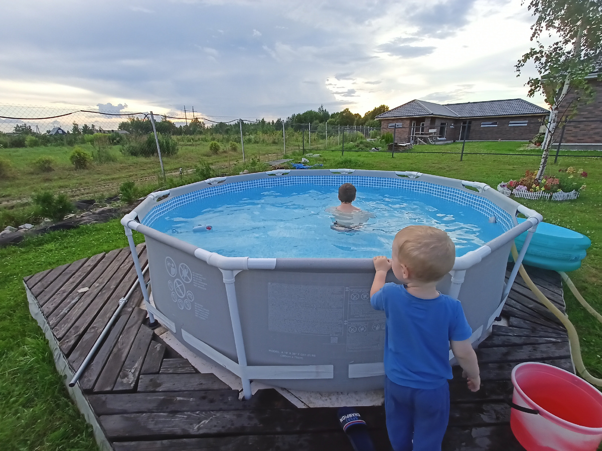Жаркая погода уже стоит несколько недель. Долго не мог решиться ставить ли бассейн в этом году. Супруге надоело ждать пока я решусь, и пока меня не было дома она собрала бассейн и наполнила водой. Кстати говоря на улицу у нас выходит сразу теплая вода. Для этого я установил термостатический клапан к которому подходит холодная вода от скважины и горячая вода от бойлера, который греется у нас газовым котлом. На клапане выставляется температура от 20 до 42 градусов по желанию. Третий выход клапана выводит смешанную воду на улицу. Такое решение позволяет набирать бассейн сразу теплой водой, поливать себя и детей с шланга, поливать растения. В будущем планирую устроить летний подземный водопровод от термостатического клапана. Нужно будет предусмотреть расположения труб под уклоном и ревизионные смотровые колодцы в нижних точках труб, в которых установлю краны для слива воды на зиму. Воду надо подвести к парникам, к будущей террасе, к будущему гаражу, возможно сделаю летний душ. В общем еще