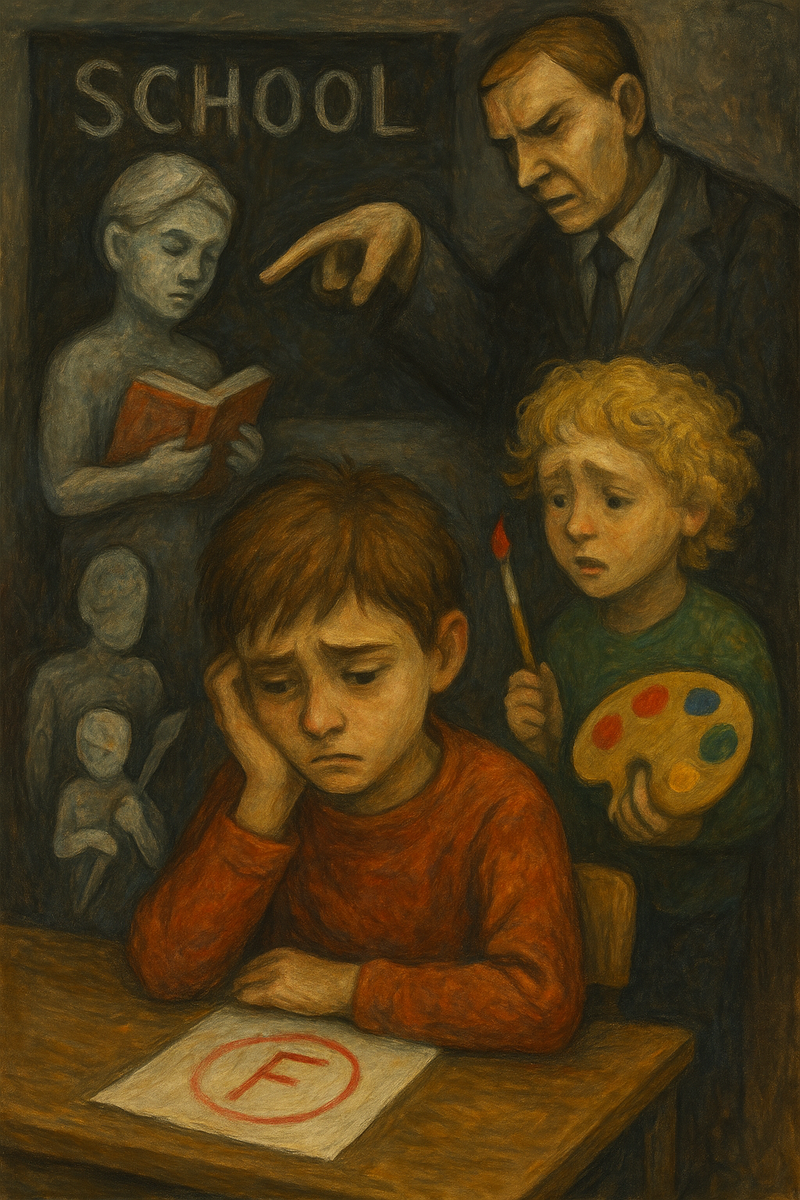 С самого детства нас учат: школа — это обязательный этап жизни, необходимый каждому. Нам говорят, что именно здесь мы получим знания, станем умнее и подготовимся к взрослой жизни. Но реальность гораздо мрачнее. Для миллионов детей школа становится не местом роста, а ареной подавления, сравнения и травли. Местом, где стираются уникальность и способности, а на их место приходит страх, выгорание и ощущение собственной никчемности. Одна программа — для всех Система образования устроена так, что всех детей ставят в одинаковые условия, независимо от их характера, склонностей, темперамента и способностей. Представь себе художника, которому запрещают рисовать, и заставляют решать уравнения. Или изобретателя, которому не дают экспериментировать, потому что "по программе сейчас литература". Школа не обучает думать, она обучает подчиняться. Программа ориентирована не на развитие индивидуальности, а на среднестатистический результат. Те, кто мыслят иначе, задают неудобные вопросы или идут сво