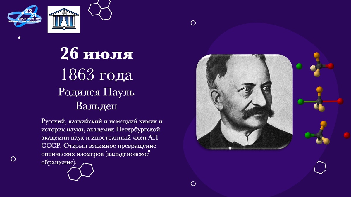 162 года назад в имении Розенбек Розулской волости Вольмарского уезда Лифляндской губернии Российской империи родился будущий химик Пауль, или как его звали в Петербурге, Павел Иванович Вальден. Вальден - уникальный ученый, который успел прожить почти век и побывать как членом Петербургской академиии наук (то есть «обычным» российским академиком), так и иностранным членом уже Академии наук СССР, поработать в трех разных странах и оставить след как в химии, так и в ее историографии. Вальден работал в Риге, где стал ректором университета, открыл знаменитое вальденовское обращение стереоизомеров, в Петербурге руководил Химической лабораторией Академии наук, той самой, основанной Ломоносовым в 1748 году и с которой фактически началась химия в России. Затем после революции работал в независимой Латвии и уехал в Германию, пережил Вторую мировую и уже в возрасте 86 лет опубликовал свою знаменитую «Историю химии», не потерявшую значения и поныне. #деньвисториихимии Материал подготовлен ИОНХ Р