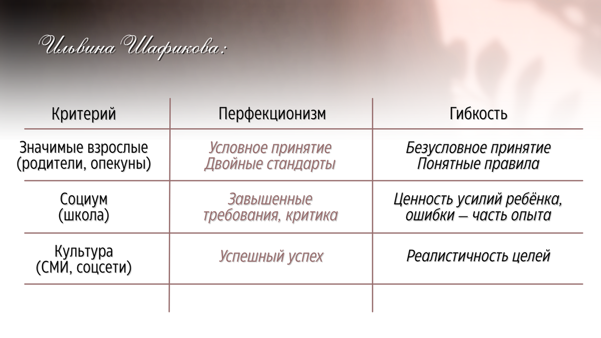 Перфекционистские качества они приобретают позже, когда начинают впитывать чужие искажённые мнения, принимая их за единственно верную истину. Сталкиваясь с осуждением и болезненным высмеиванием, дети ошибочно усваивают, что любовь, одобрение нужно заслужить, и научаются всем угождать.