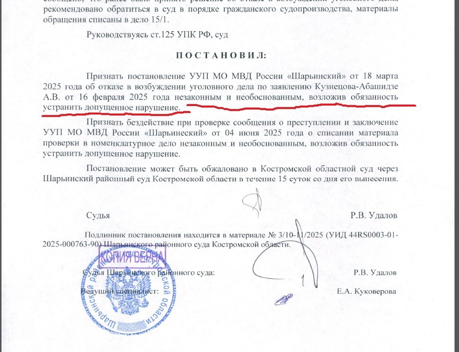 Публикация «Шарьинский районный суд признал постановление УУП МО МВД «Шарьинский» незаконным и необоснованным