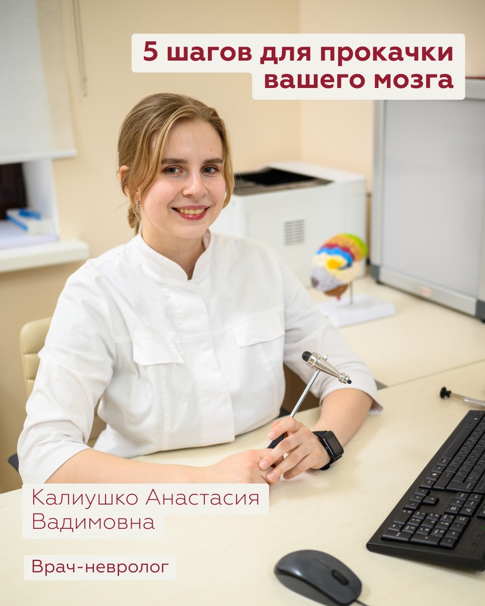 Постоянно забываете, куда положили ключи? Трудно сосредоточиться на работе? Путаете даты? 🧠 Ваш мозг – это суперкомпьютер, который нуждается в регулярной подзарядке! Врач-невролог Калиушко Анастасия Вадимовна собрала 6 простых способов, которые помогут сохранить молодость и остроту ума! 1. Тренируйте мозг: играйте в настольные игры, изучайте новые языки, читайте книги, смотрите интеллектуальные передачи. Освоение новых навыков – единственный способ формирования нейронных связей, обеспечивающих качественную работу мозга. 2. Будьте активны: гуляйте, ходите в спортзал, на танцы. Регулярные физические упражнения улучшают кровообращение, в том числе и в мозге. 3. Правильно питайтесь: включите в рацион рыбу, орехи, ягоды, зеленые овощи. Ограничьте потребление сахара. 4. Поддерживайте социальную активность: общайтесь с родными, почаще встречайтесь с друзьями. 5. Не забывайте о важности баланса труда и отдыха! Своевременный и достаточный отдых помогает восстановить когнитивные ресурсы нашег