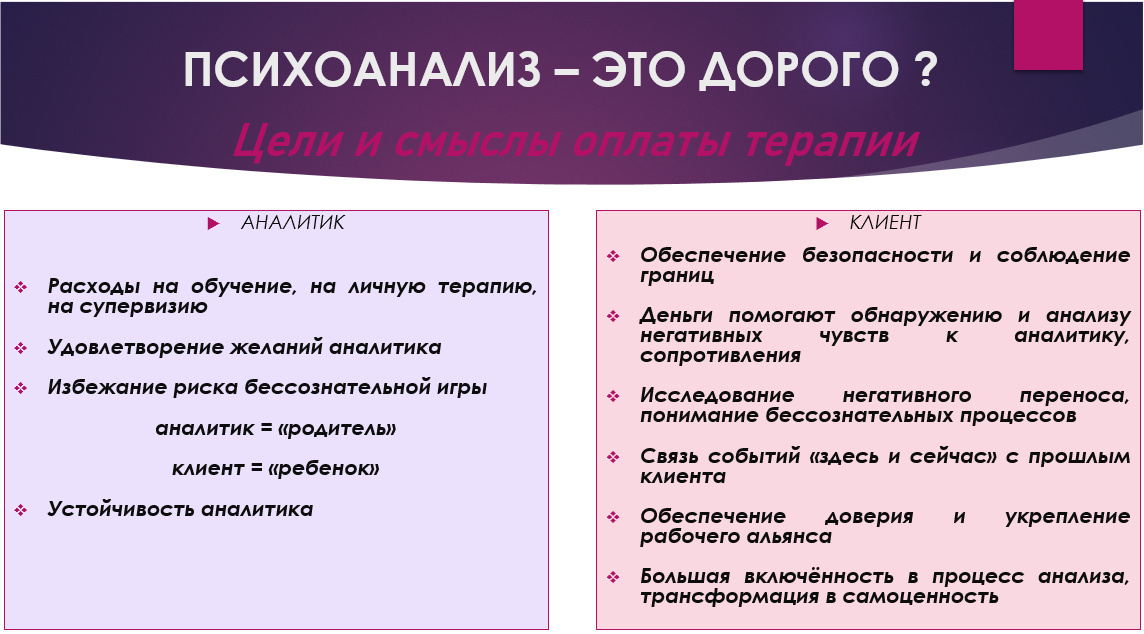 Психоаналитическая терапия - это дорого. Давайте поговорим о смыслах и сути оплаты терапевтических сеансов. Посмотрим на это с позиции аналитика. Аналитик много времени посвящает подготовке, в которую входит обучение теории, прохождение супервизии своей практики, личная терапия. Как правило, если у аналитика нет иной статьи дохода, все эти расходы необходимо учитывать при формировании цены его практики. Кроме того, назначение адекватной, удовлетворяющей цены способствует тому, что желание аналитика удовлетворяется. Это снижает риск ситуации, когда специалист может бессознательно начать включаться в различные игры, в которых он может выступать, например, в качестве единственного спасителя/родителя клиента, что создаёт сложность в понимании бессознательных процессов и приводит к тупикам в терапии. Также в терапии важна устойчивость аналитика. Его удовлетворённость размером гонорара способствует этому. Если размышлять с позиции клиента, то наличие оплаты, в первую очередь призвано обеспеч