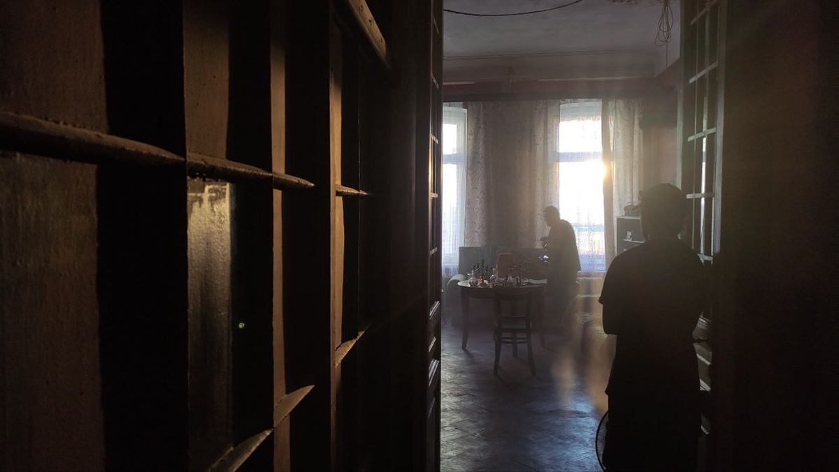 А сейчас уже вся в декорациях, в одной комнате сымитировал пожар и очень много приспособлений для быстрой смены интерьера.