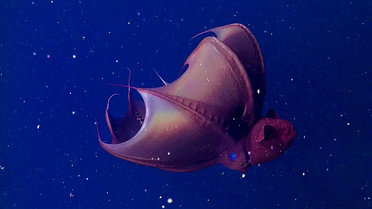 Я всегда считал, что самые страшные существа — те, что скрываются в темноте. Но когда впервые увидел снятый на камеры подводного аппарата адский кальмар-вампир, я понял: некоторые монстры не просто скрываются — они созданы, чтобы быть незаметными. И при этом выглядят так, будто сошли со страниц научной фантастики. Это не кальмар. Это не осьминог. Это — вампироцид, или как там по-научному Vampyroteuthis infernalis — буквально «вампир из ада». И хотя он размером всего с банан, его биология настолько необычна, что заставляет пересмотреть всё, что мы знаем о жизни в океанских глубинах. Самое первое, что шокирует — это цвет его крови. Да, у адского кальмара-вампира кровь голубая. И дело не в магии, а в химии. Вместо гемоглобина, содержащего железо (как у нас), он использует гемоцианин — белок, в котором основу составляет медь. Когда медь соединяется с кислородом, кровь становится голубой. Это не редкость в мире моллюсков, но в сочетании с внешностью вампироцида это выглядит почти сверхъест