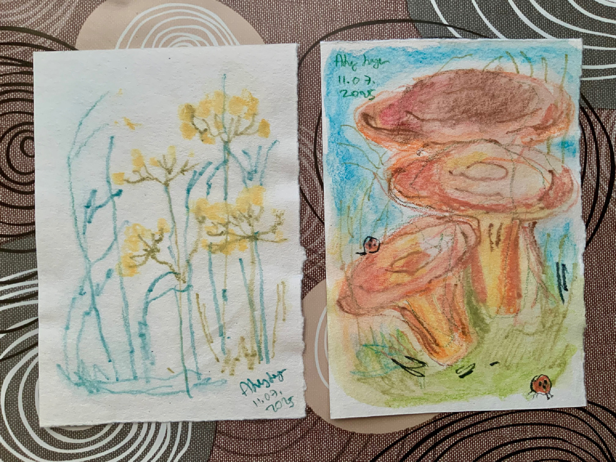 Это просто укроп и грибы (вроде бы, лисички) 🦊 Рисунки выполнены акварельными карандашами. Рисунки простые, но выполнены в порядке эксперимента с акварельными карандашами.