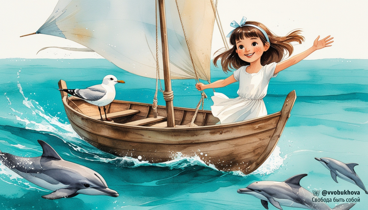 Бризвиль, открытое море, 26 июля Сегодня проснулась с ощущением, что слова в моей голове спутались в один большой, тугой узел. «Писательский запой», — как назвала это тётя Эля, увидев мой пустой взгляд. Посмотрела на меня, потом в окно, на раскачивающиеся на ветру верхушки сосен. — Кажется, твоим мыслям нужен попутчик, — сказала она. — Пойдём, попробуем его позвать. Мы пошли на самый край пирса. Тётя достала из своей холщовой сумки потрёпанного, самодельного воздушного змея в форме чайки. Она ловко запустила его в небо, и он, поймав ветер, запел — тонко и протяжно, словно звал кого-то. Мы ждали. И через десять минут из-за скалистого мыса появилась маленькая парусная яхта. «Дух Бризвиля» — так называли эту яхту старые рыбаки. Белоснежный парус, потемневший дубовый корпус и странная привычка появляться именно тогда, когда кому-то особенно нужно оказаться в открытом море. Она шла беззвучно, на борту не было ни души. Подошла к пирсу так плавно, словно была живой, и замерла, приглашая нас н