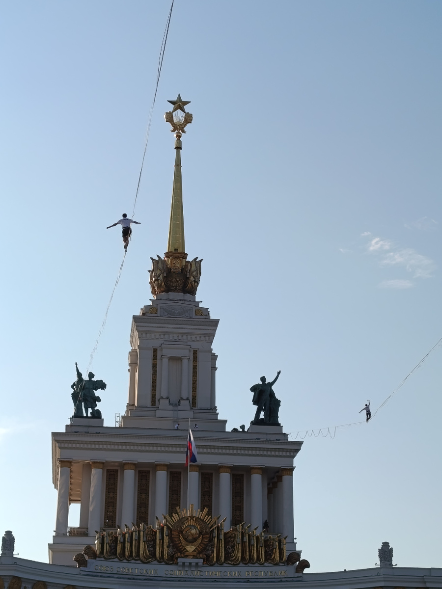 В густой толпе пробиралась я к ВДНХ, вдоль строительной техники, убирающей монорельсовую дорогу, перешагивая через лежащие кабели и сидящих бомжей...пока едва не воткнулась в спину впереди идущего. Человек замер и смотрел вверх.... Над центральным павильоном на головокружительной высоте ходили люди! Под голубым летним небом над огромной территорией парка скользили гимнасты! Пока я снимала их на фото и видео, кто-то сверху нежно положил мне руку на плечо. Я подпрыгнула, обернулась - с высоты ходулей на меня смотрела очаровательная девушка в ярком бордовом платье. Мы поулыбались, сфотографировались, а в меня уже летела кегля. "Хотите попробовать?" - спросил меня жонглёр. Нет, это не шизофренический сон я вам рассказываю. Это один день совершенно невероятного фестиваля воздушных гимнастов "Трапеция", прошедший на ВДНХ 24 июля 2025. На территории от Центрального павильона до фонтана Каменный цветок каждый сантиметр пространства дарил чудеса: здесь учили гимнастике на полотнах, здесь