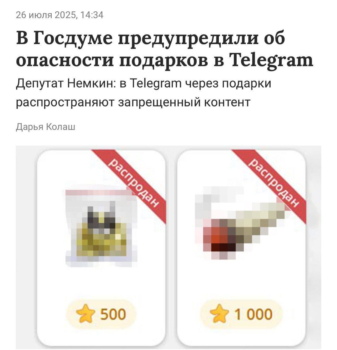 🙁Россиян могут наказать за подарки в Telegram В Госдуме предупредили, что россияне рискуют получить реальные сроки за подарки в Telegram, содержащие ссылки на запрещенные материалы. Мошенники могут использовать такие подарки для отправки жалоб в Роскомнадзор, что приводит к блокировке аккаунтов и передаче данных силовикам. Предупредите родных и близких, чтобы они были осторожны ➡️ 👍 Подписаться на канал ПЛАТИМ ЗА ЭКСКЛЮЗИВНЫЕ КАДРЫ