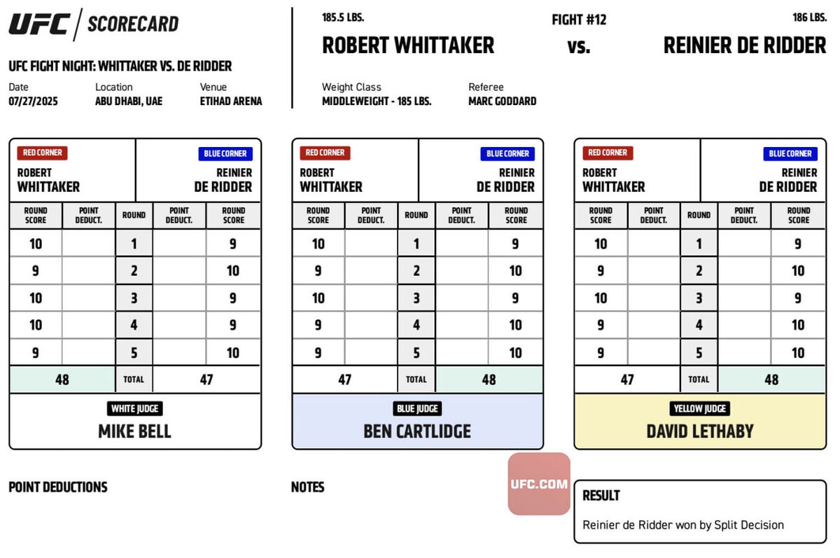 Судейские карточки с боя Уиттакер 🆚 Де Риддер Ваше мнение? 📷 UFC News