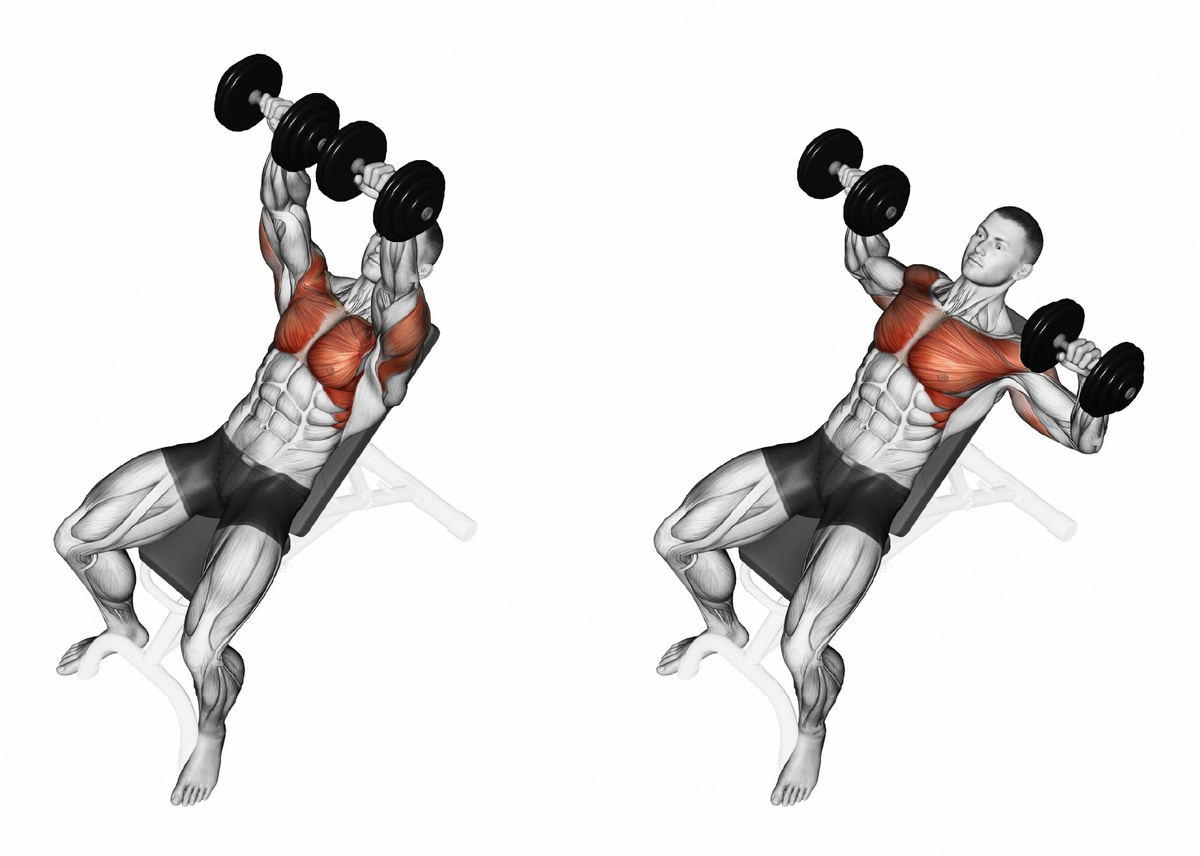Жим гантелей лёжа на скамье под углом — упражнение, направленное на развитие грудных и плечевого пояса. От угла наклона скамьи зависит, на какую группу мышц будет распределяться нагрузка: Техника выполнения: Важно: если упражнение слишком тяжело, нужно сбавлять вес. Также рекомендуется начинать с лёгкого веса, чтобы сосредоточиться на правильной технике. Есть противопоказания: проблемы с суставами (локтевыми, кистевыми, плечевыми).