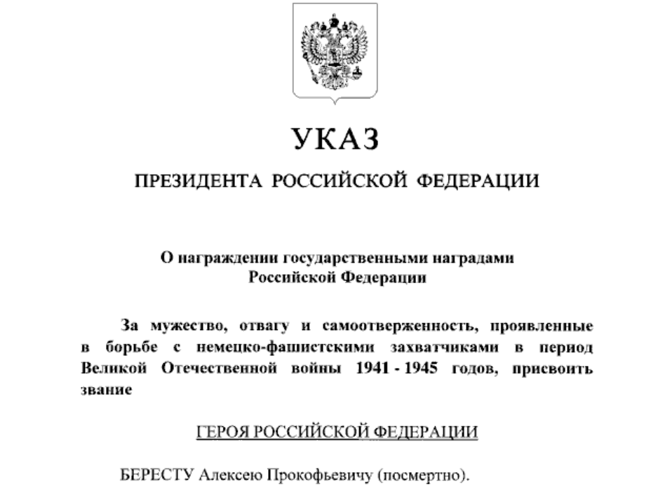Раньше в газетах и журналах была популярна рубрика «Награда нашла героя». К лейтенанту Алексею Прокофьевичу Бересту она подошла бы как нельзя лучше. Буквально десять дней назад Президент России Владимир Путин своим Указом за №480 присвоил ему звание Героя России. Посмертно. «За мужество, отвагу и самоотверженность, проявленные в борьбе с немецко-фашистскими захватчиками в период Великой Отечественной войны 1941-1945 годов».