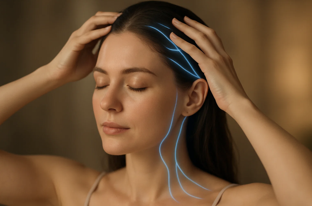 2. От макушки к ушам и шее: Положите ладони на макушку. Очень мягко скользите ладонями или подушечками пальцев вниз и в стороны, к ушам, а затем к лимфоузлам за ушами и на шее. Представьте, что мягко направляете жидкость к точкам выхода.
