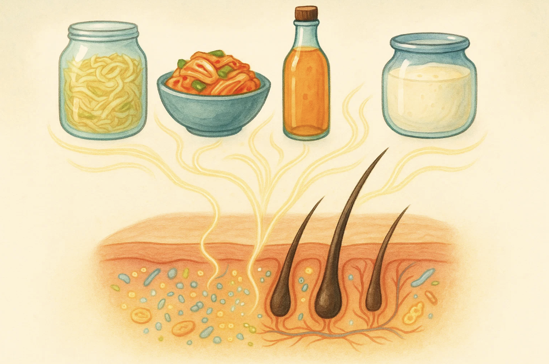 Наше тело населяют триллионы микроорганизмов, включая кожу головы. Растет интерес к роли микробиома и связи кишечника с другими органами, например, с кожей. Могут ли квашеные продукты с пробиотиками помочь коже головы и волосам? Рассмотрим факты. Микробиом кожи головы: невидимый защитник волос Микробиом кожи головы — это сообщество бактерий и грибков. Его баланс важен по нескольким причинам. Полезные бактерии помогают поддерживать слегка кислую среду кожи, что мешает вредным микробам размножаться. Они укрепляют защитный барьер кожи, не пуская внутрь вредные вещества и аллергены. Здоровый микробиом помогает контролировать местные иммунные реакции, снижая риск излишнего воспаления. Некоторые бактерии могут участвовать в процессах, влияющих на волосяные фолликулы. Нарушение этого баланса вызывает проблемы. Избыточный рост дрожжей Malassezia часто связывают с перхотью и себорейным дерматитом, которые проявляются зудом, покраснением и шелушением. Дисбаланс микробиома может также приводить к